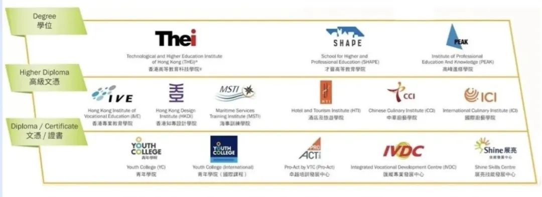 香港高等科技教育学院(本科); 高峰进修学院(专业培训、专业考试、顾问服务); 才晋高等教育学院(专升本); 香港专业教育学院(大专); 香港知专设计学院(大专); 国际厨艺学院(大专); 青年学院(中专); 卓越培训发展中心(实训中心); 展亮技能发展中心(弱能人士服务); 汇纵专业发展中心(再培训); 中华厨艺学院(实训中心); 海事训练学院(实训中心); 酒店及旅游学院(实训中心)